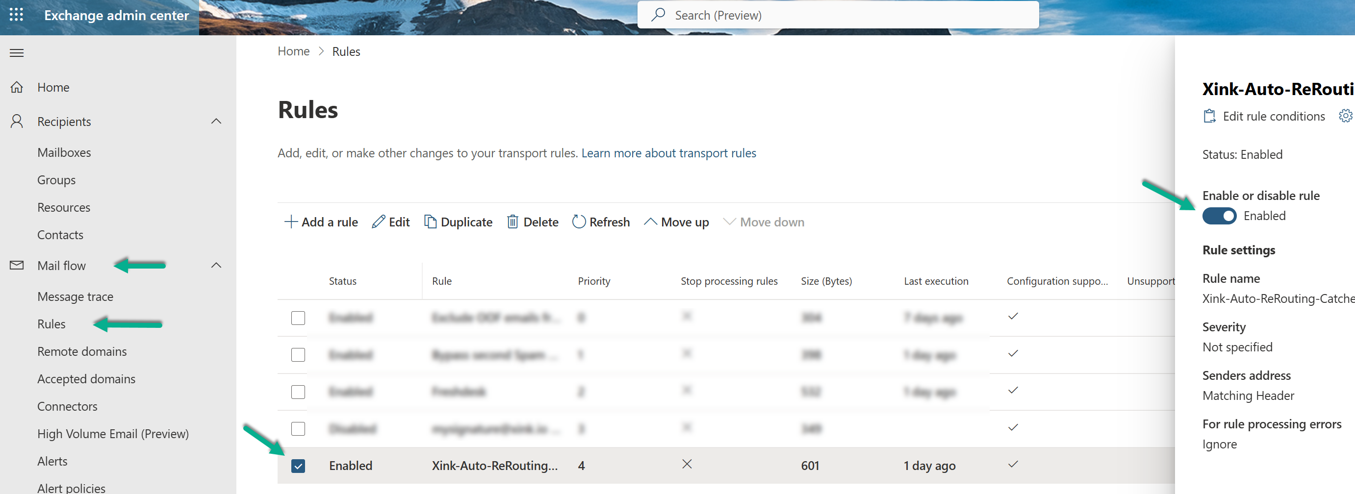 Step 2. Navigate to Rules > Mail flow and find the rule 'Xink-Auto-ReRouting-Catcher' and then untick to disable the rule.
