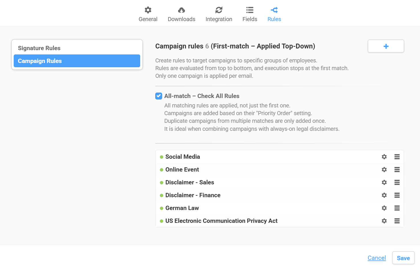 The All-Match Rule is the correct choice for companies that want to run email signature campaigns and include departmental or country-specific legal disclaimers.